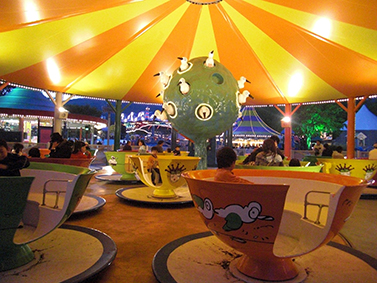 小さなお子様からおじいちゃん、おばあちゃんまでのんびり楽しめるアトラクション。しかし、真ん中についているテーブルを回し続ければ、なんと最強絶叫マシンに早変わり!!食後の高速回転には注意が必要!ブルーな気分にならない程度に楽しみましょう…。