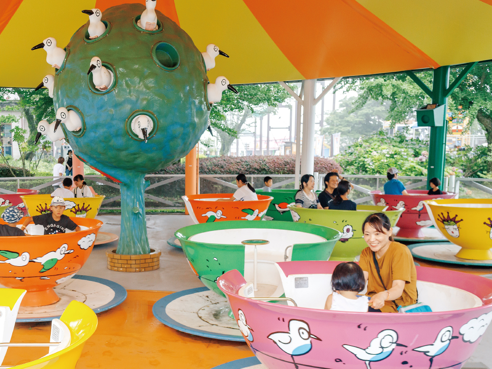 かわいい『こうのとり』がモチーフの、のんびりアトラクション。おじいちゃん、おばあちゃんと一緒に楽しもう。