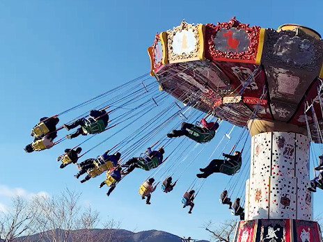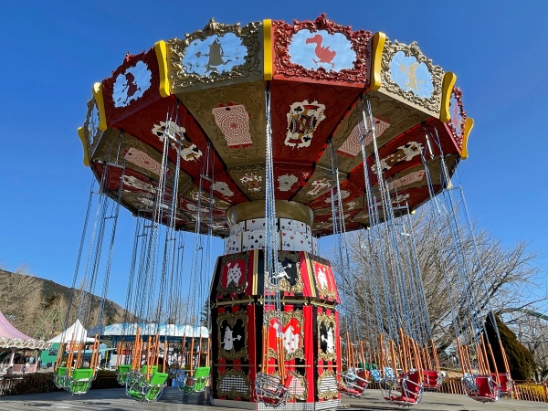 グルグル回りながら、波のような動きを繰り返す空中ブランコ。 小学生ぐらいのお子様たちに人気が高いアトラクションです。